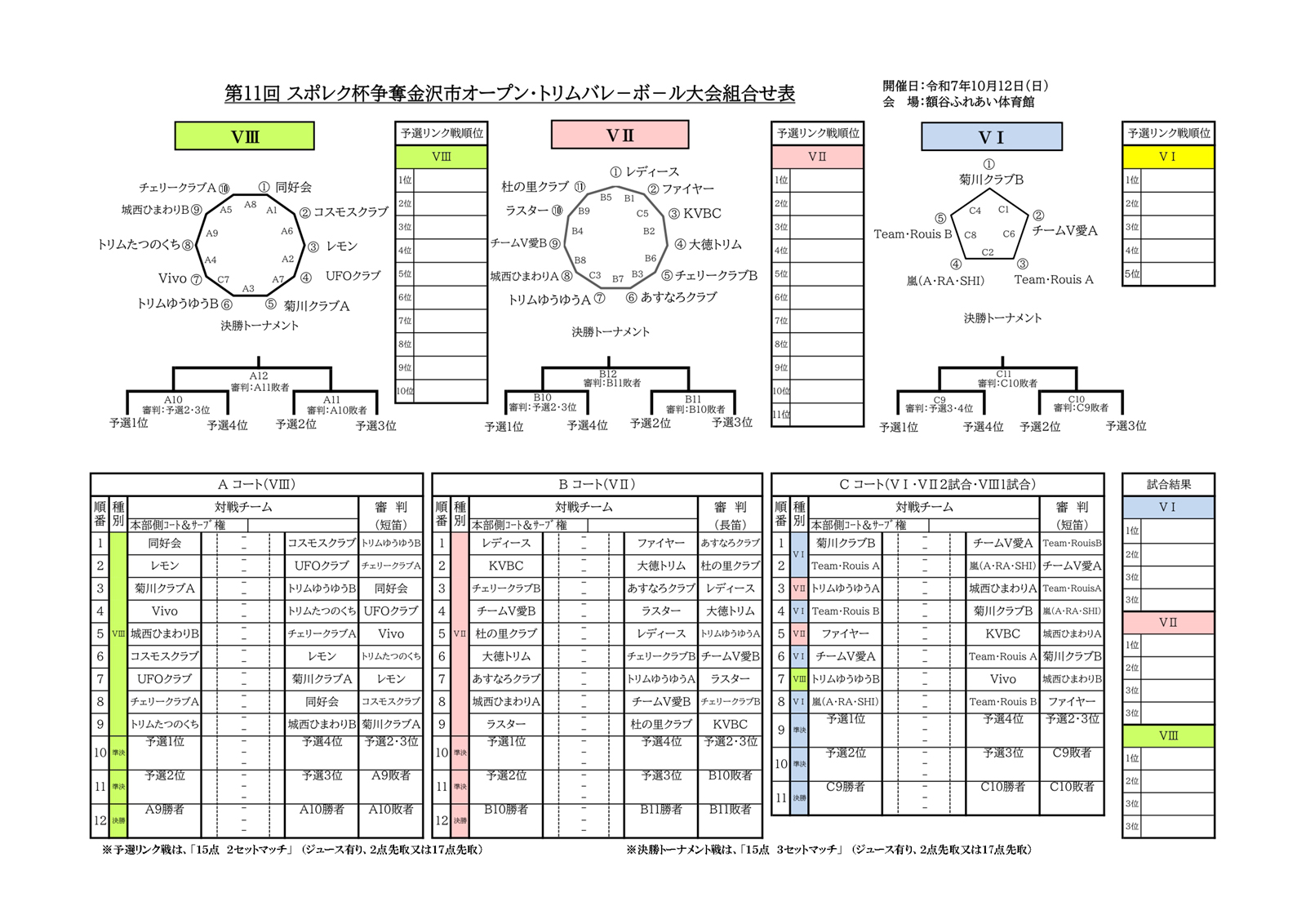 2025/09/22 令和7年度スポレク杯の試合要項・組合せ表 いつも金沢市中高年トリムバレーボール連盟をご愛顧頂き誠にありがとうございます。 令和7年度のスポレク杯の試合要項をお知らせ致します。 詳しい概要は以下のPDFをご確認ください。 スポレク杯試合要項 【組合せ表】